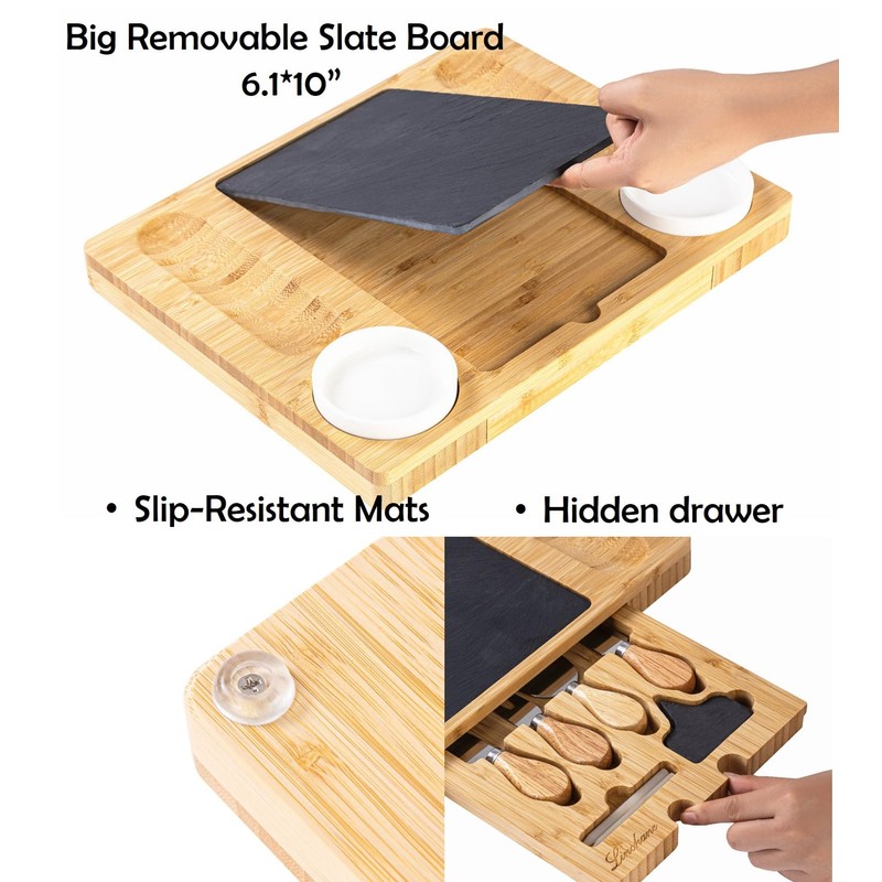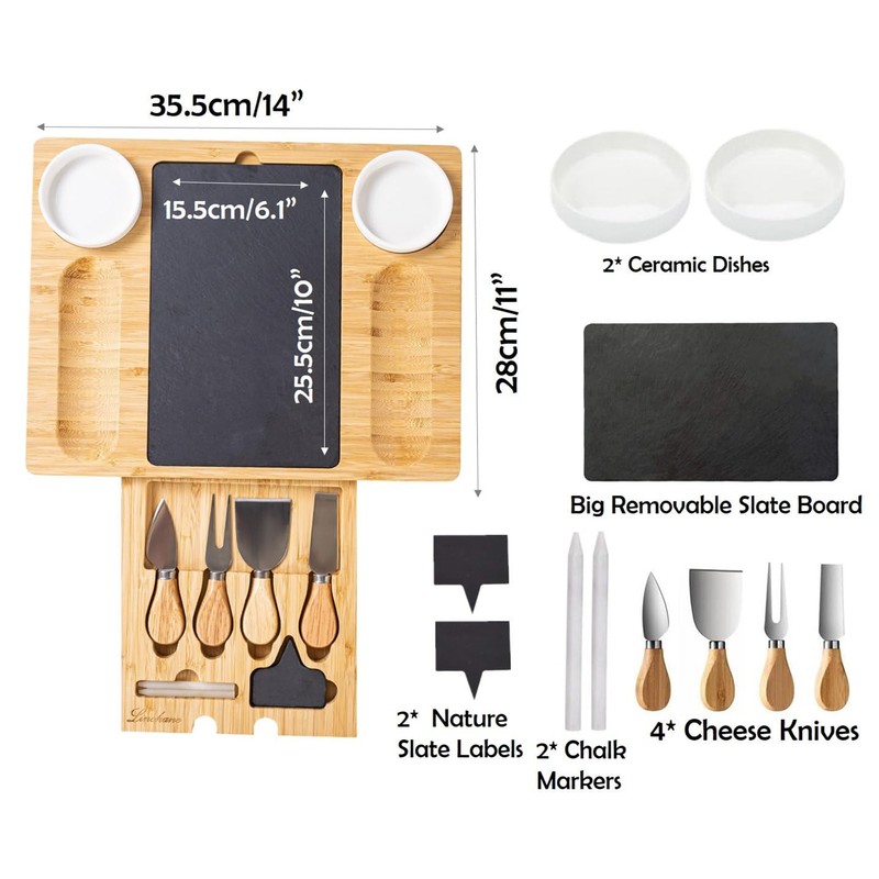 - Removable embedded Slate Boards & Chalk Markers – All cheese boards include large, removable embedded slate boards for easy marking, Cheeseboards with drawer come with 2 slate labels and 2 chalk markers to name your carefully prepared dishes.