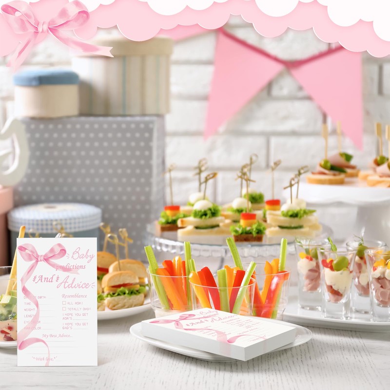 Lincia 50 Pcs Coquette Baby Shower Prediction and Advice Cards Pink Bow Prediction Wishes for Baby Shower Games Activity Gender Reveal Party Supplies Mom Dad Party Decorations