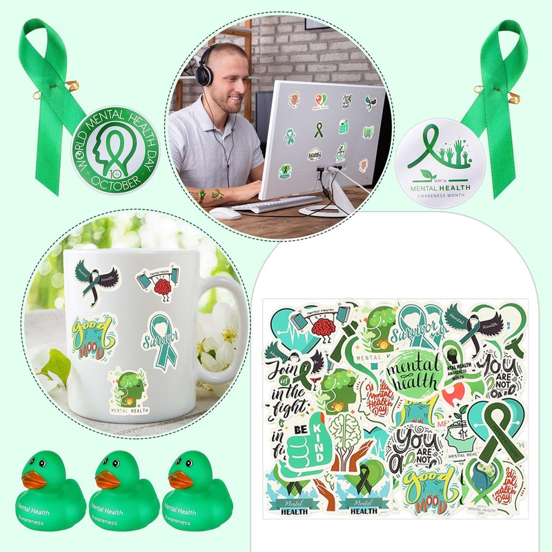 - Mental Health Awareness Decorations: there are 15 green ribbons with gold pins, 5 ballpoint pens, 98 mental health stickers, 15 round badges, 15 silicone wristbands, 15 lanyards with safety buckle, 5 football stress balls, 5 vinyl ducks and 15 acrylic keychains, a total of 188 pieces of mental health awareness items in the package, which are sufficient to meet your needs and uses