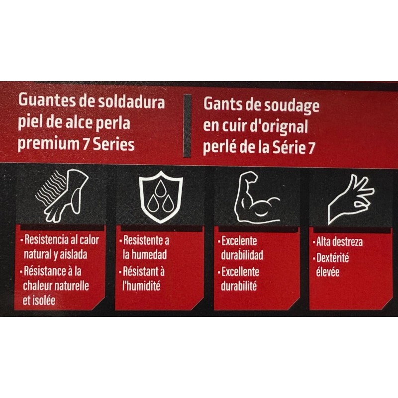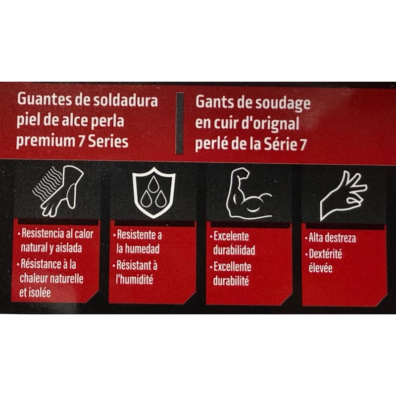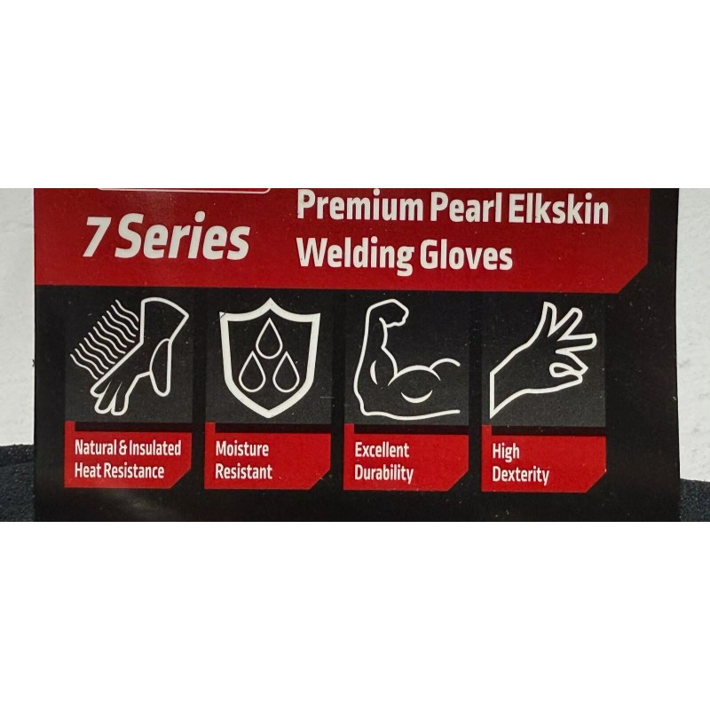 The Premium 7 Series Welding Gloves are constructed of pearl elksin which provides an excellent balance of dexterity, heat resistance and durability. The unique internal design features an insulated top hand for enhanced heat resistance while the palm is unlined for improved dexterity and feel. To increase durability each seam is reinforced with a leather welt and sewn with Kevlar(R) thread. Available in sizes Medium to Extra Large.