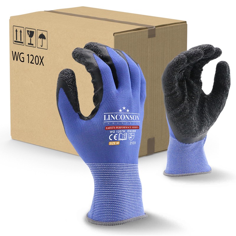 LINCONSON 12 Pack Safety Performance Series Construction Mechanics Wrinkle Latex Work Gloves (Blue, X-Large (12 Pairs))