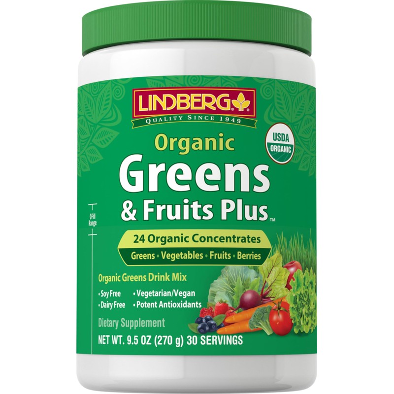 Lindberg Organic Fruit and Vegetable Powder | 9.5 oz | Greens Drink Mix | 28 Concentrates Plus | Vegan, Non-GMO, Gluten Free Supplement