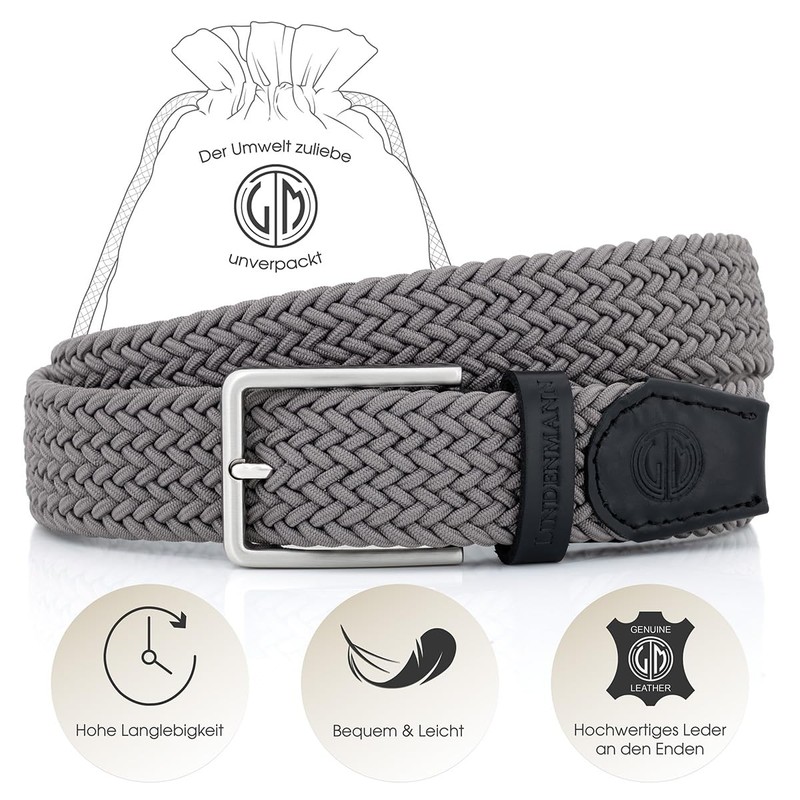 LINDENMANN stretch belt for men - grey braided belt with black leather details, ideal for golf and leisure. The LINDENMANN stretch belt combines sporty design, high wearing comfort and high-quality materials in a versatile accessory. The grey textile braided belt with loop, end piece and ends made from 100% full-grain leather in black offers maximum flexibility and a secure fit - ideal as a golf belt and for the stylish casual look. The matt silver pin buckle gives the belt a modern, elegant look. The subtle LINDENMANN brand logo is not embossed in the clasp, but in the leather loop and the end piece. Thanks to the elastic braided structure, the stretch belt adapts perfectly to the body movement and ensures the highest level of comfort - during sports as well as in everyday life. With a width of 3.2 cm, the belt fits perfectly with golf trousers, jeans and chinos and complements any sporty outfit with a stylish detail. Durable materials and high-quality workmanship make this belt a reliable companion for active men.
