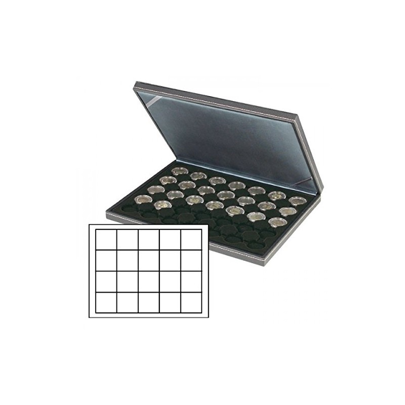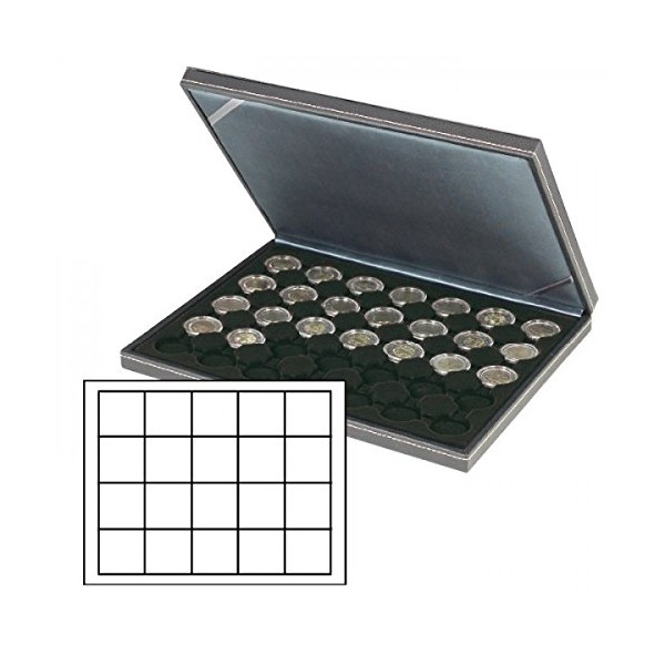 Lindner 2364-2120CE NERA M coin case with a black insert with 20 rectangular compartments. Suitable for coins or coin capsules with Ø up to 47 mm.