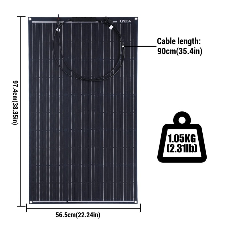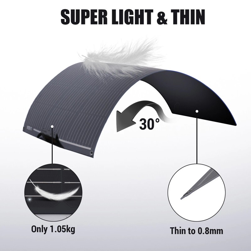 [Flexible Ultra Thin] Compared to traditional solar panels, this flexible solar panel is extremely flexible and weighs only 1.05kg, which is at least 70% lighter than traditional solar panels. It can be bent moderately and is only 0.8mm in thickness and only 974*565mm in size. easily transport, install, hang and remove.