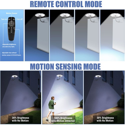 【3 LIGHTING MODES AND WIRELESS REMOTE CONTROL 】Radar body sensing + light control + remote control, intelligent light control system, automatic charging during the day, automatic lighting at night, intelligent human body radar sensing, light up when people come, and turn off when people leave, with a large sensing range.
