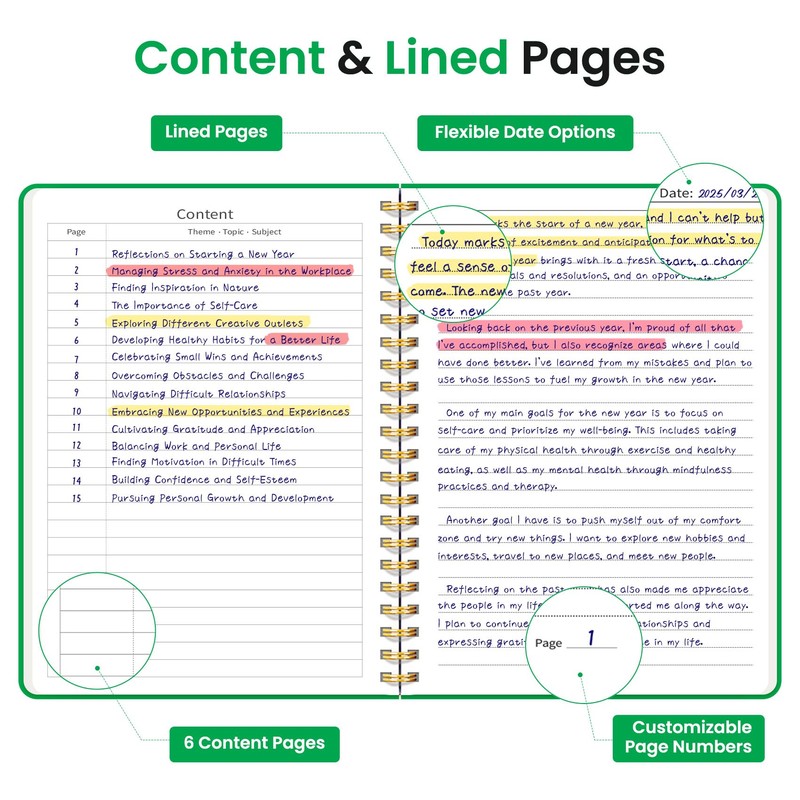 - Organized and Functional Design: With 140 lined pages and a 6-page blank table of contents, our notebook offers ample space for note-taking and easy referencing. An inner pocket keeps miscellaneous items secure, and an elastic closure band ensures the notebook stays closed when not in use.