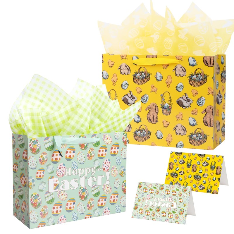 - You would get 2 pack cute easter gift bag with 4 easter tissue paper, and 2 easter greeting card