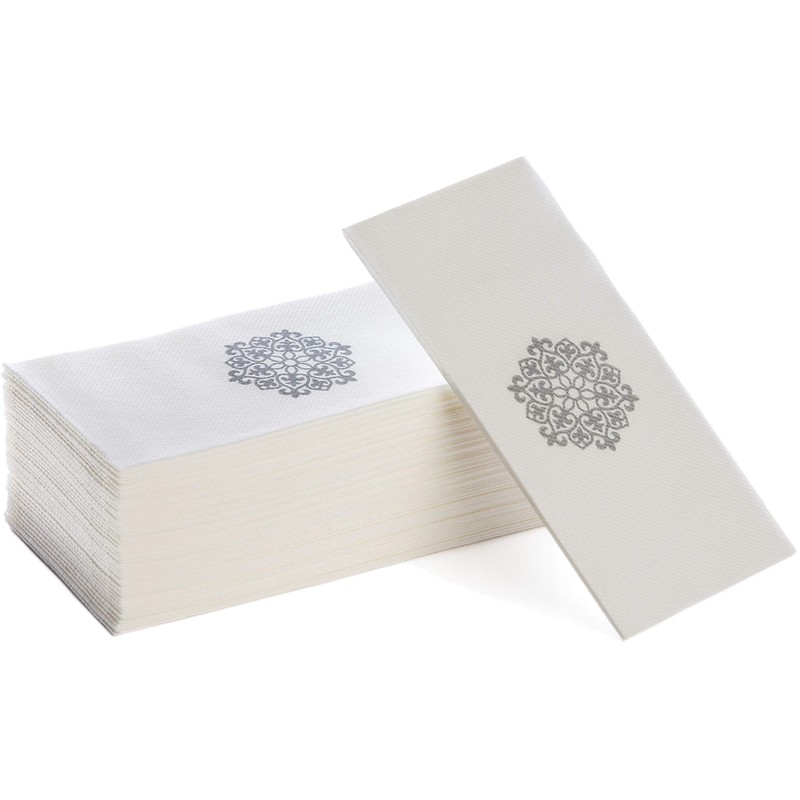 Linen-Feel Guest Towels | Decorative Bathroom Napkins | Soft, Absorbent Disposable Paper Hand Towels for Kitchen, Bathroom, Parties, Weddings, Dinners Or Events White and Silver Napkins 100 Pack