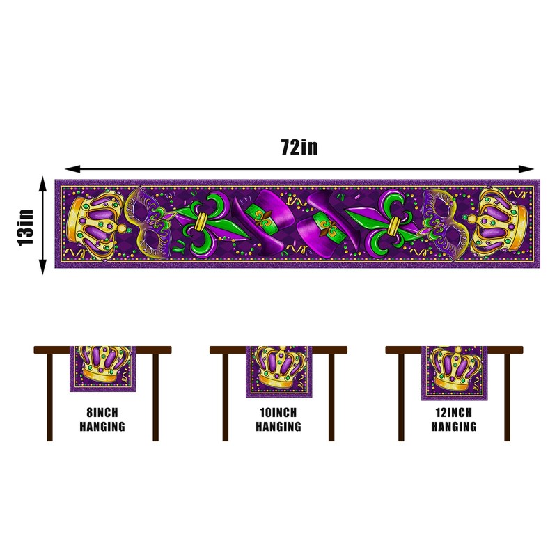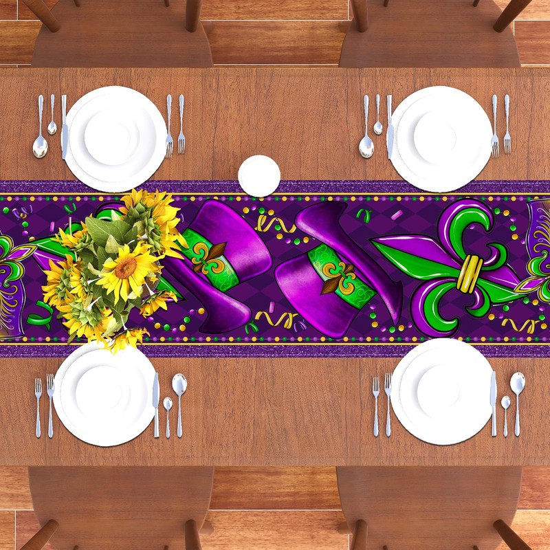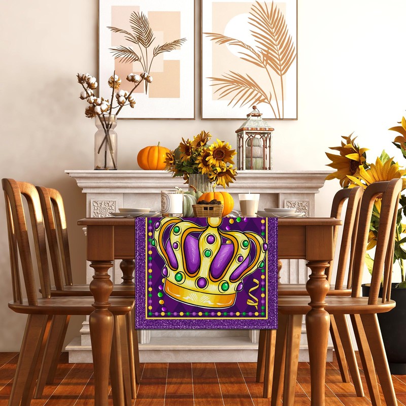 Linen Mardi Gras Table Runner Purple Mask Beads Iris Fleur De Lis Tablecloth Fat Tuesday Brazil Carnival Masquerade Party Birthday Decorations and Supplies for Home Kitchen Table-13×72''