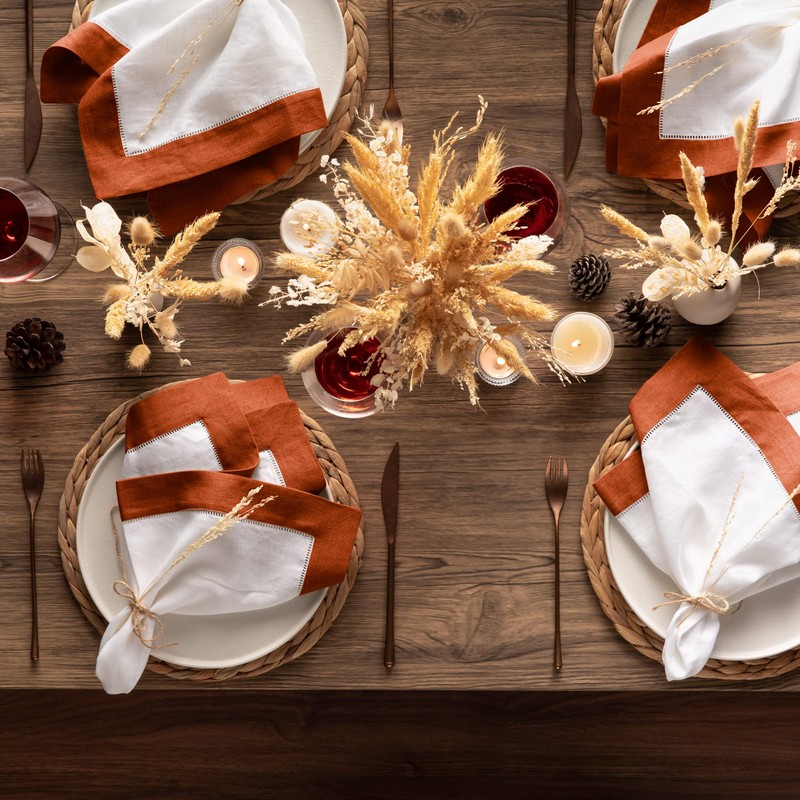 - LUXE HEMSTITCH LINEN NAPKINS - White linen at the centre, a classic hemstitch line contrasted with vibrant orange borders that bring warm and uplift the mood of any room. Pairing orange with white creates a relaxed vibe that will instill a little fun around your dinner table. It’s perfect for the Fall and Thanksgiving
