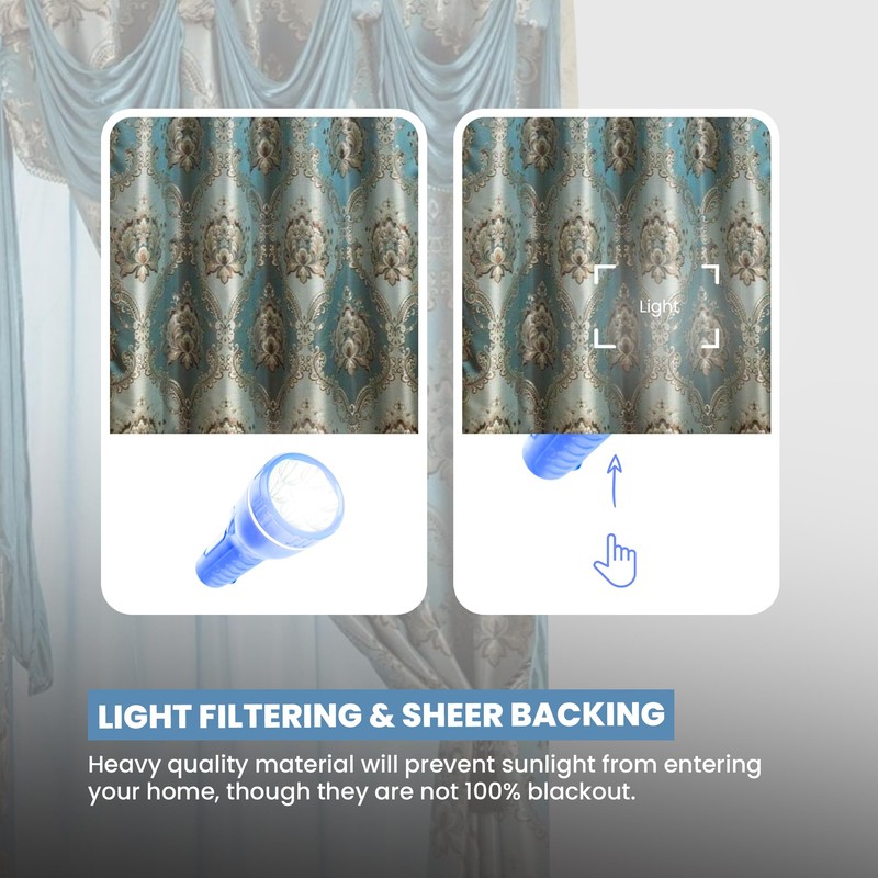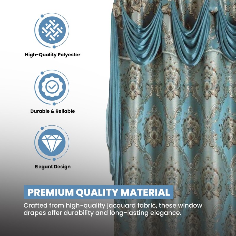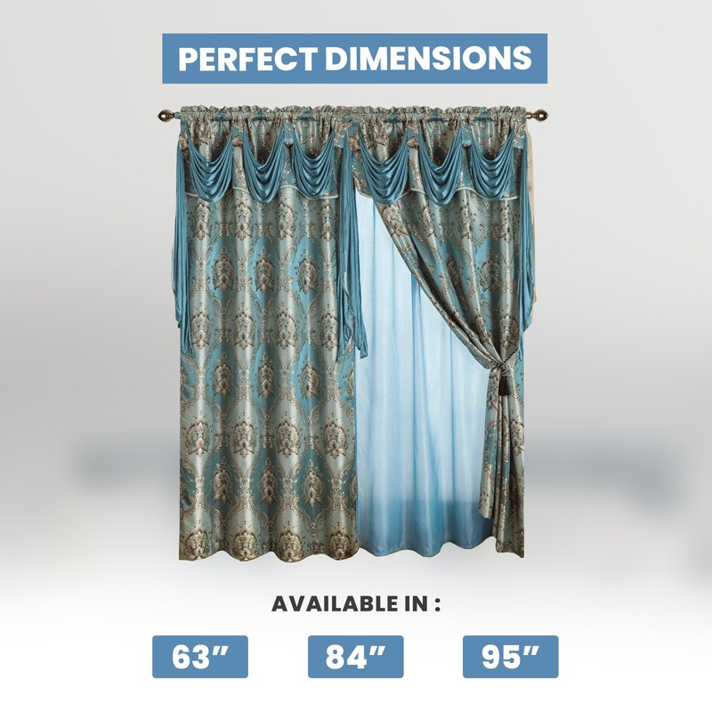 LinenTopia Classical Jacquard Window Drape Set (2 Panels), Includes Valance and Sheer Backing, Traditional Victorian Style Floral Curtain Drape Panels for Living Rooms, (Elsa, 63, Blue)