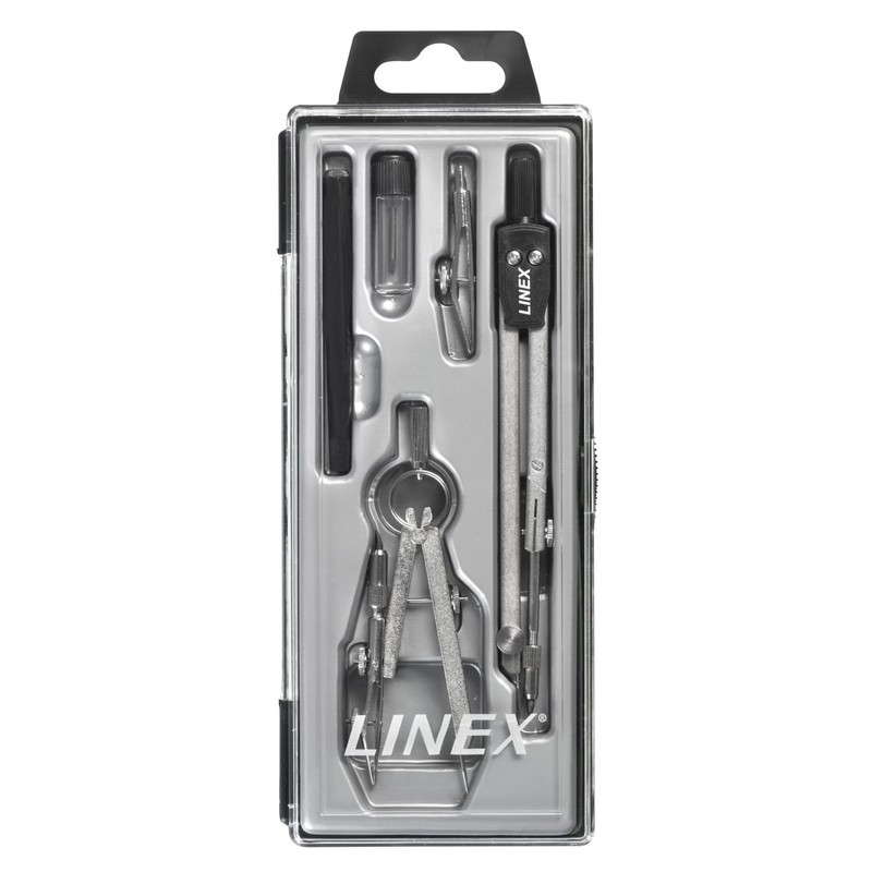 - Hinged lid case in black with compass with knee joint, insert spring with holder, lead box and divider