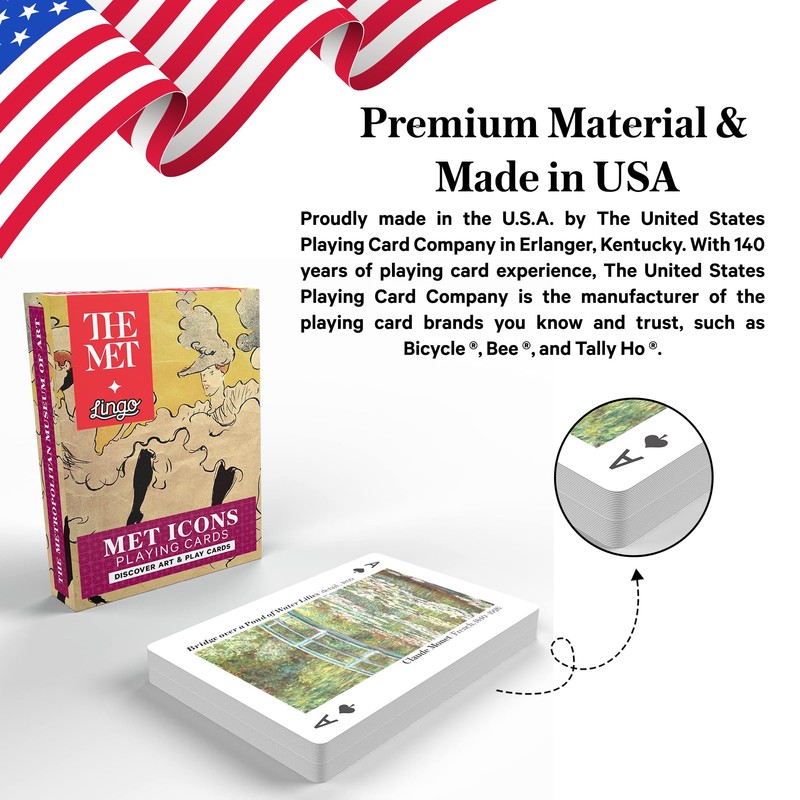 • STANDARD PLAY DECK - The Met x Lingo's deck of cards brings together a handpicked selection of striking art from across The Met collection. Each deck of cards has 52 of the Met’s most compelling Icons exhibit along with key trivia.