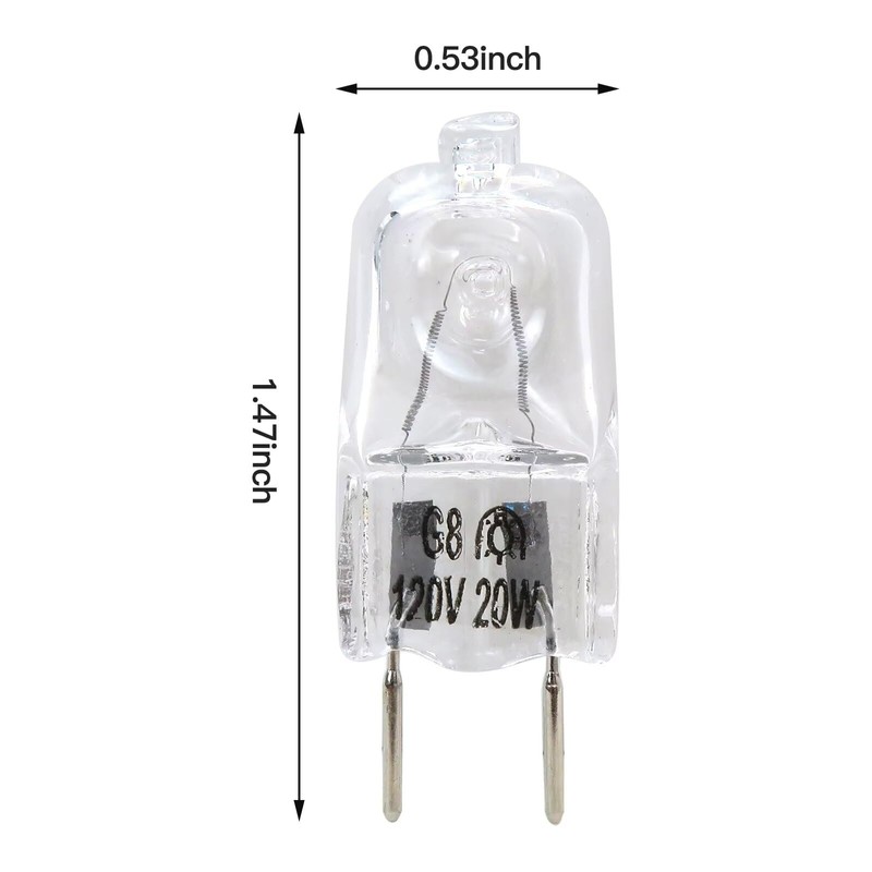 - Specification: G8 bi-pin base, 120V, 20W, 1.47" in length, 0.53" in width