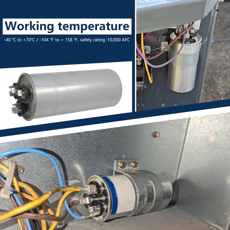 This capacitor is used for start-up and operation of AC motors with frequency of 50Hz/60Hz such as Industrial Grade Replacement for Central Air-Conditioners, Heat Pumps, Condenser Fan Motors, and Compressors.It is small in size, lightweight, heat resisting and anti-explosion.Round capacitor can be used to substitute oval shape one with the same MFD AND Volt specs.A 440 volt capacitor can be used in place of a 370 volt, as it is build better, but the 370 can’t be used in place of a 440 volt.
