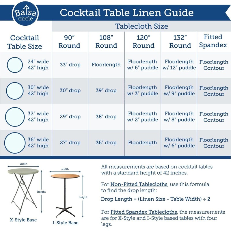 - MEASUREMENTS – Each fitted tablecloth fits 24" - 36" wide x 42" tall cocktail table. Use them at wedding ceremonies and receptions, bridal and baby showers, quinceaneras, parties, and other special events.