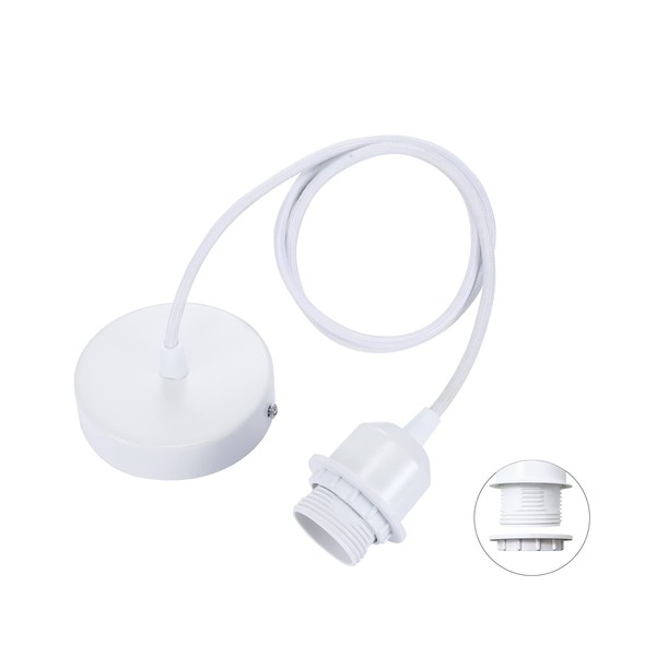 Linkind Metal Pendant Light Fitting, Ceiling Rose E27 Screw Lamp Holder with Lock Ring for Shade, 100cm Braided Flex Cable, Industrial Style, White, 1 Pack