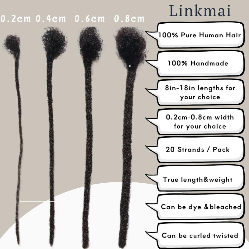 Linkmai Inter Dreadlock Extensions 100% Human Hair for Men/Women/Kids, Full Handmade Locs Extensions, 20 Strands, 8-18 Inch Length, 0.2-0.6 cm Width, Can Be Dyed, Bleached, and Curled (0.4CM, 16Inch)