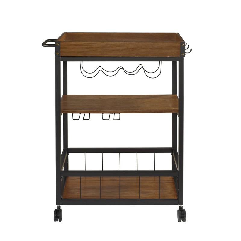 Rustic and industrial in style and design, the Austin kitchen cart is perfect for adding storage to small dining rooms and kitchens. Crafted from metal, the base of the table features a Black finish, while the wood planked top and shelves have a rich brown finish. Storage for wine bottles and glasses adds versatility to the piece. Easy roll casters provide for easy mobility.