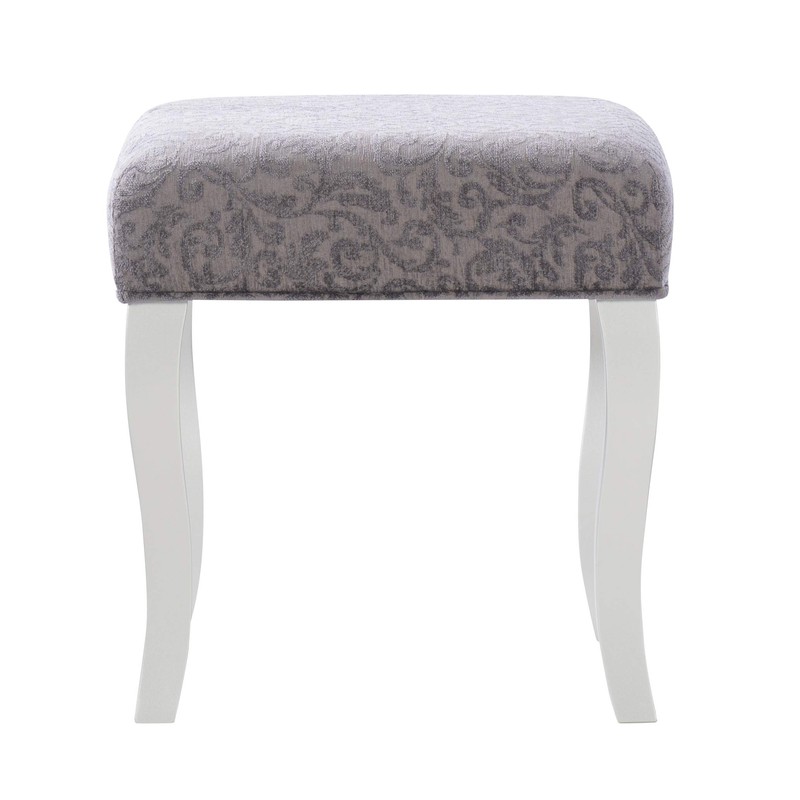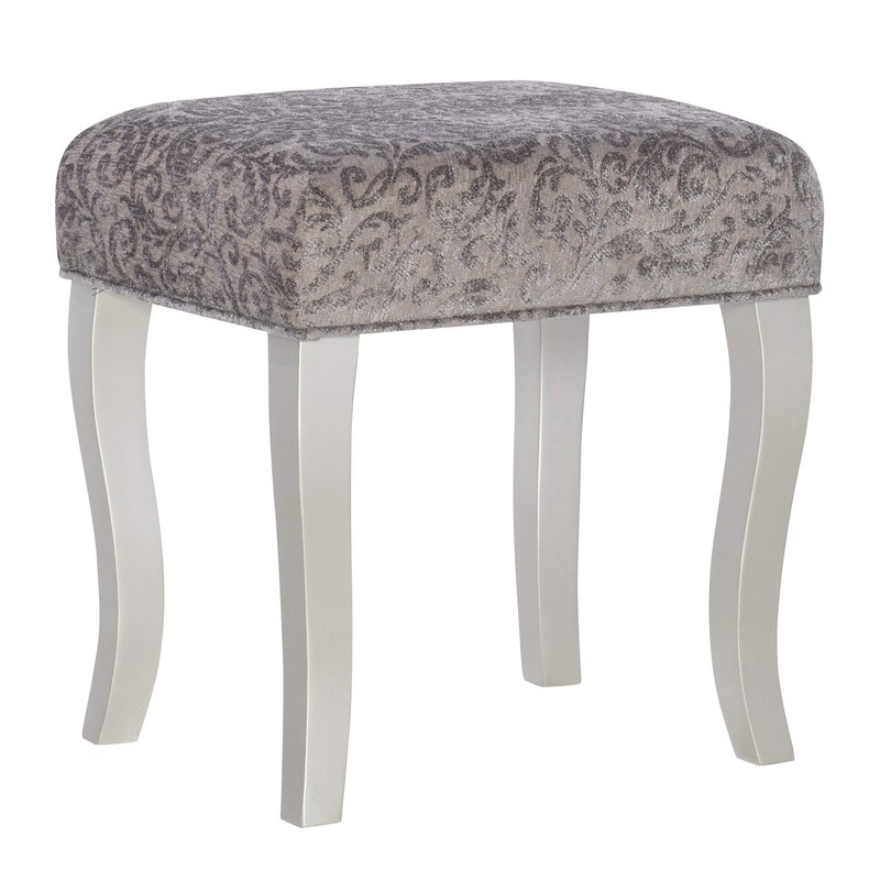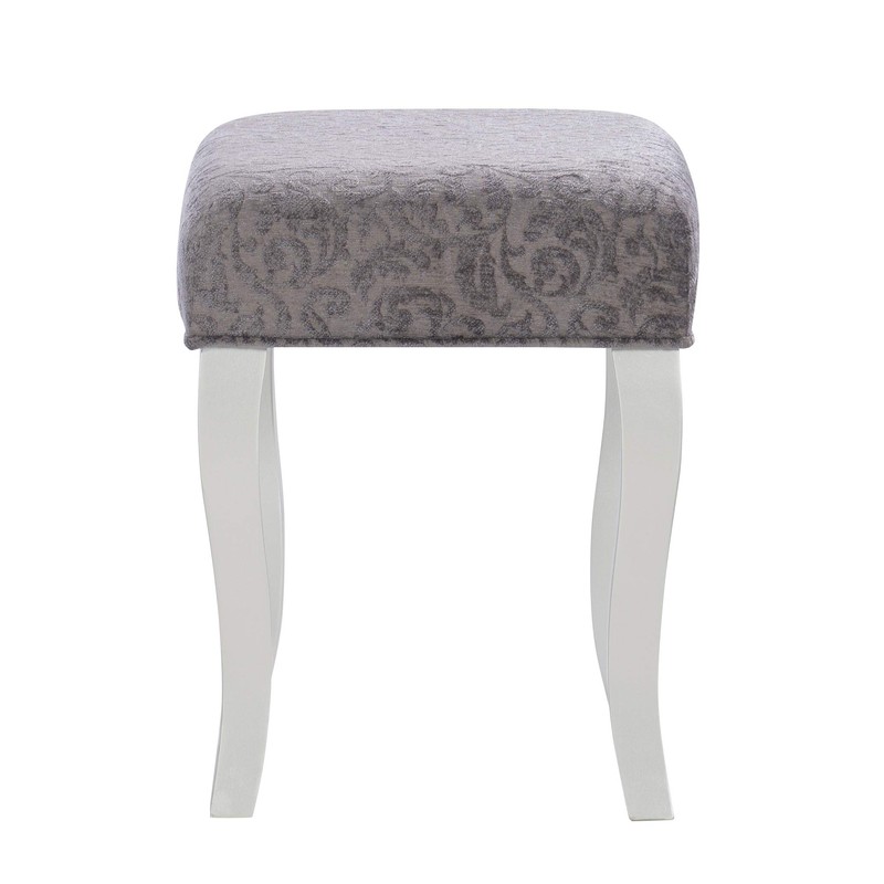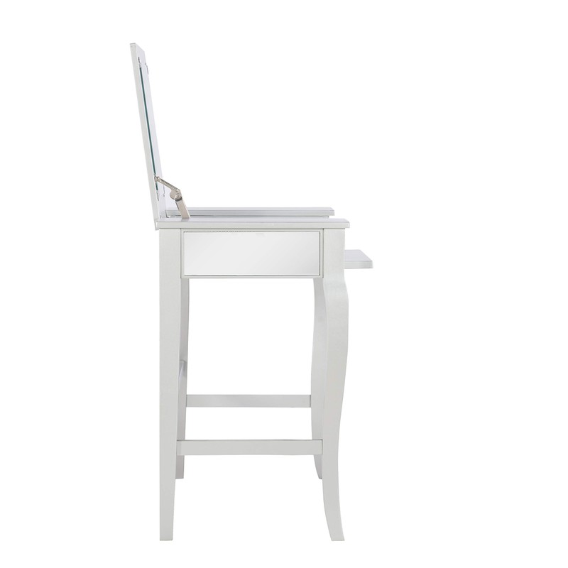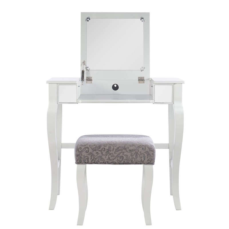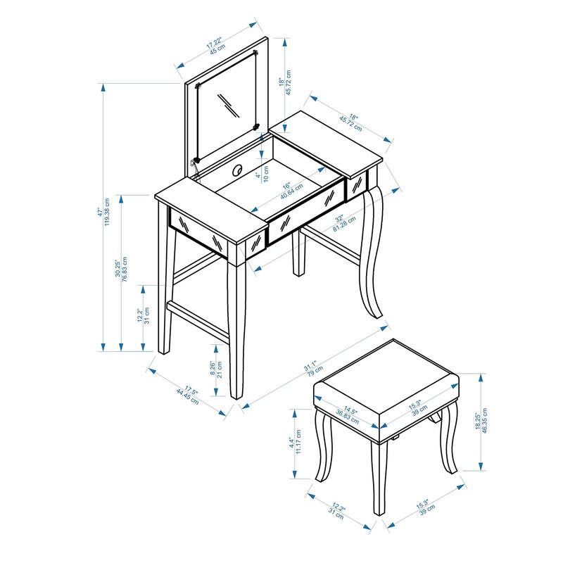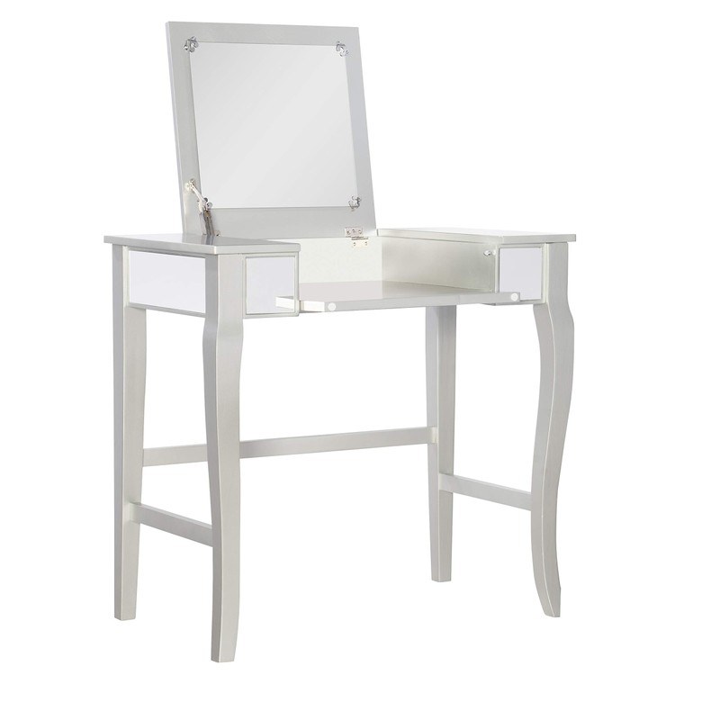 Glamorous in design and style, the Harper Vanity set is perfect for adding to a bedroom or dressing area. The Vanity has an eye-catching silver finish accented by a mirror front and sides. The Middle of the Vanity top lifts up to reveal hidden storage space. Decorative curvy front legs complete the design. A matching stool is upholstered in a pewter gray fabric. Vanity Size: 32 W X 18 D X 30.25 H Inches ; Stool Size: 17 W X 14 D X 18 H Inches