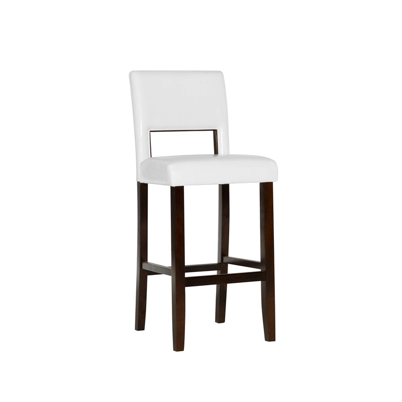 The 30" Vega Bar Stool features a rich, dark espresso finish. Great for homes with dark accents, this stool also has a padded white PVC vinyl seat and back. The legs are slightly tapered for a more elegant look, while the four foot rails provide stability and comfort. This stool is durable enough for a busy kitchen, yet elegant enough for a more formal setting.