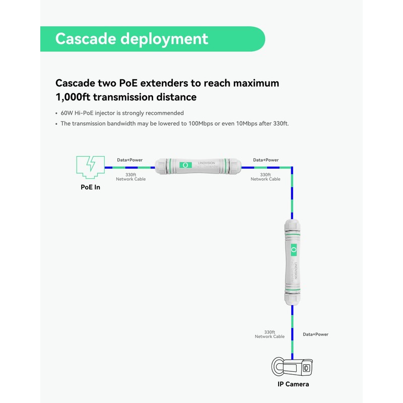 - CASCADE DEPLOYMENT - Supports three levels of cascade deployment, therefore total 400m POE + Data transmission is provided. Bandwidth will be lowered to 10Mbps over 250m. The longer the distance, the lower the bandwidth.