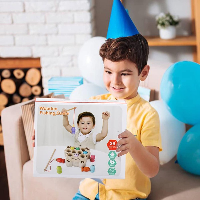 - Magnetic fishing game: fishing game with cute frog shape. Each set includes 2 magnetic wooden fishing rods, 1 wooden sorting box and 10 colourful wooden fish.