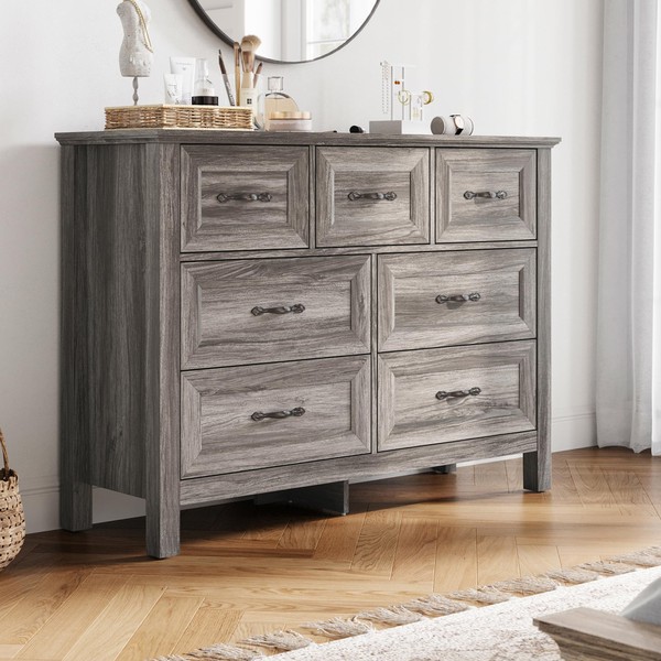 LINSY HOME 7 Drawers Dresser for Bedroom, 47" Wide Wooden Storage Chest with Antique Handles, Modern Farmhouse Dresser TV Stand with Wood Legs for Closet, Living Room, Hallway, Grey
