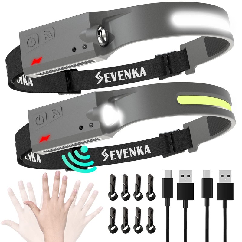 Linterna frontal recargable, SEVENKA 2 faros LED, haz ancho, faro con sensor de movimiento