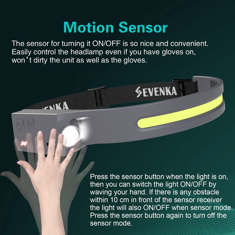 - Modo de sensor y luz manos libres. Este faro de inducción recargable está diseñado con modo de sensor de movimiento, controla fácilmente el faro incluso si tienes guantes puestos, no ensucia la unidad ni los guantes. Cuando la luz está encendida, puedes pulsar brevemente el botón del sensor y hacerloo modo de sensor (la luz indicadora se vuelve amarilla de rojo) A continuación, puedes encender/apagar la luz agitando la mano dentro de 10 cm delante de la recepción del sensor. Mientras está en modo sensor, también puedes cambiar el modo de luz pulsando el botón de encendido.