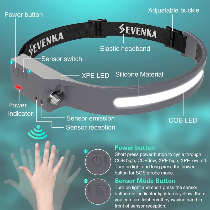 - Múltiples modos de luz y ligera luz de diadema SEVENKA solo pesa 2.47 onzas con batería de litio integrada de 1200 mAh. No sentirás nada incluso si lo llevas todo el día. Pulsa brevemente el botón de encendido 5 veces para pasar a través de COB alto/COB bajo/XPE alto/XPE bajo modo/OFF. Pulsa el botón de encendido mientras la luz está encendida, puede giraro luz estroboscópica SOS para situaciones de emergencia. Diademas ajustables para adultos o niños, y se proporcionan para hacer que tu cabeza obtenga la mejor condición cómoda.