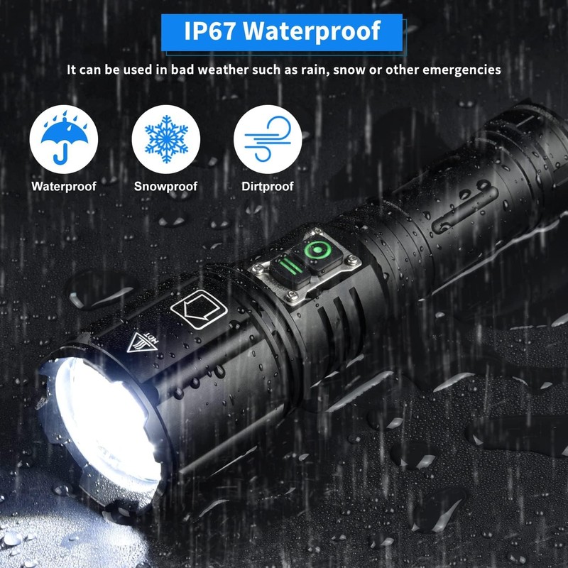- 【Aleación de aluminio resistente al agua IP67】 La linterna led recargables alta potenciaestá hecha de aleación de aluminio a prueba de explosiones y tiene una clasificación de impermeabilidad IP67. Se puede usar fácilmente incluso en días lluviosos y nevados. Es a prueba de golpes y puede soportar una caída de 4 metros. Se puede utilizar en diversos entornos de trabajo peligrosos, como gasolineras, plantas químicas y plantas de gas natural, para garantizar la seguridad y la protección contra explosiones.