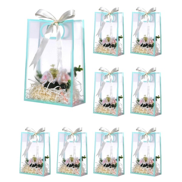 Liobelon 12 Pieces Clear Plastic Gift Bags with Handle Reusable Transparent Gift Bag with Ties PP Gift Wrap Tote Bag with Ribbon for Wedding Bridal Shower Birthday Party 7x10x3.15 Inch (blue)