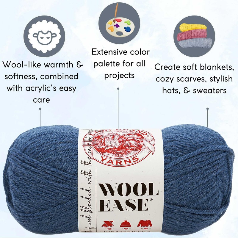 - Includes 6 skeins of Wool Ease Denim 620-114 with 1 Craft Project Bag worsted weight yarn for knitting and crocheting. Experience the warmth and softness of wool with the easy care of acrylic, all while enjoying its versatility and value.
