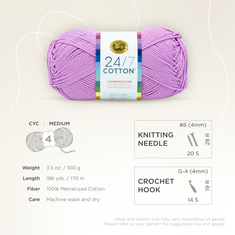 - El algodón 24/7 es un hilo de estambre hecho de algodón 100% mercerizado en colores vibrantes. El proceso de mercerización le da al hilo un color increíble, una magnífica definición de puntada y un brillo que durará varios ciclos de lavado. Contenido de fibra: 100% algodón mercerizado; CYC #4 Medium. Instrucciones de cuidado: lavar y secar a máquina. Cada madeja pesa 3,5 oz/100 g; cada madeja mide 170 m (186 yardas).