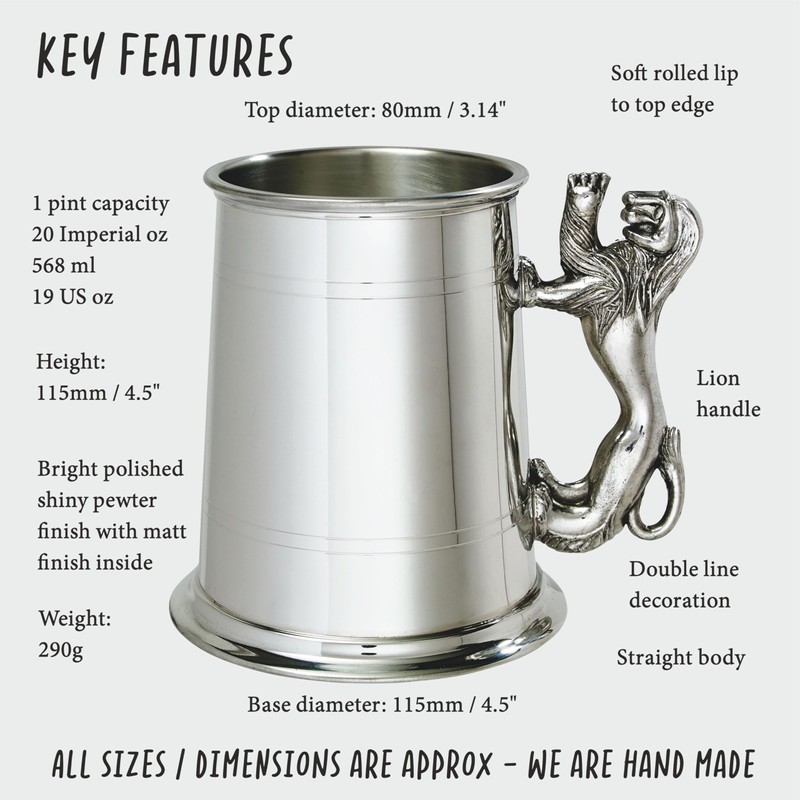Get ready to roar with excitement with our Lion Handle Tankard, where the engraving is as free as a lion in the wild! Crafted to hold a mighty pint, this pewter tankard is adorned with double line details fit for a king of the jungle. But the mane event? The handle! Shaped like a majestic lion, it'll make you feel like the ruler of your own drinking kingdom. With a bright polished finish that shines brighter than the savanna sun, this tankard is just begging for your personal touch. It's perfect for engraving your name, a fierce motto, or even a lion's roar! Handcrafted with pride in the UK and packaged in a sturdy carton box, it's the perfect gift for any brave soul ready to embark on their drinking adventure!