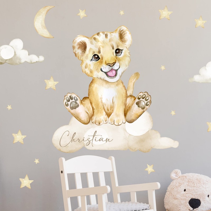 Lion on the Cloud V331 with Desired Name | Hand-Drawn | Sticker Nursery | Wall Sticker for Children's Room with Stars Baby Lion Baby Room Personalised (120 x 120 cm)