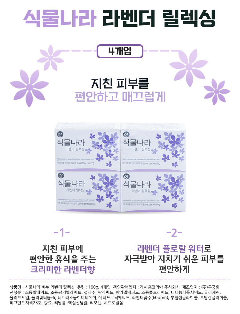 라이온 식물나라비누 클렌징비누 라벤다 100g 4입