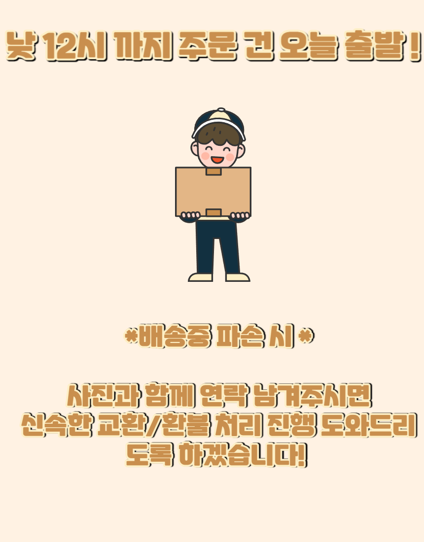 본 제품을 구매하시면 원활한 배송을 위해 꼭 필요한 고객님의 개인정보를 (성함, 주소, 전화번호 등) 택배사 및 제 3업체에서 이용하는 것에 동의하시는 것으로 간주됩니다.