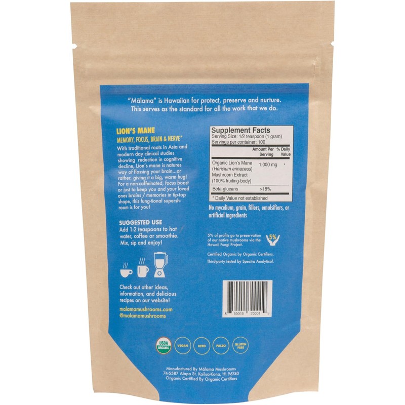 Lion's Mane Extract Powder by Malama, Organic Fruiting Body Lions Mane Mushroom Powder, Superfood Adaptogenic, Supports Memory, Focus, Brain, & Nerves