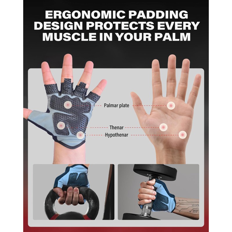 - ⇨ BREATHABLE GEL PADDED PALM FOR COMFORT: Experience superior comfort with the breathable gel padded palms. The gel padding in these workout gloves ensures excellent protection against blisters, calluses, and hand fatigue during weightlifting, rowing, pull-ups, and other high-intensity exercises. These gloves are specifically designed for gym workouts and strength training.