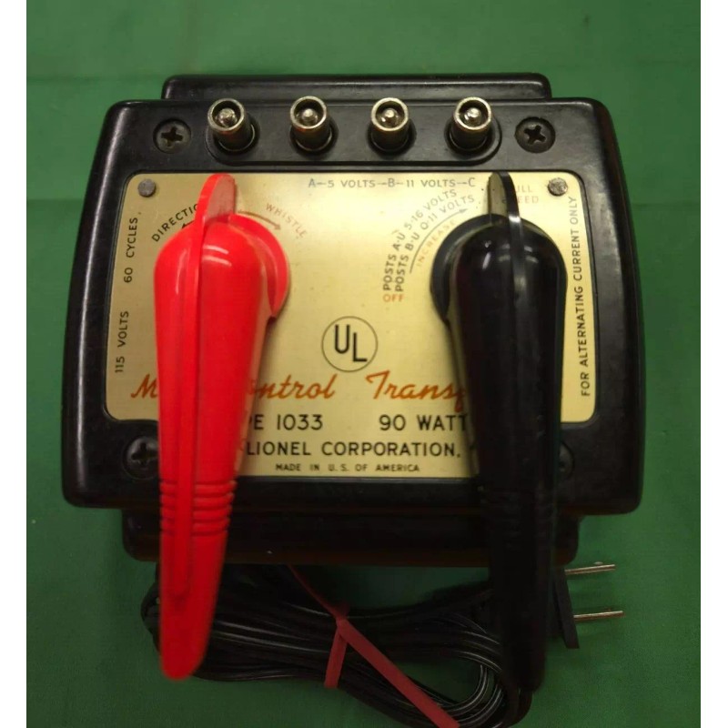 Lionel Multi-control Transformer #1033  90 watt has been refurbished. We clean, inspect and replace anything that looks like it will fail. Tested and works as it should. Contact me with any questions or requests. We may have multiple quantities of each item so if you want to see the exact one that will be sent to you before shipment, let us know.