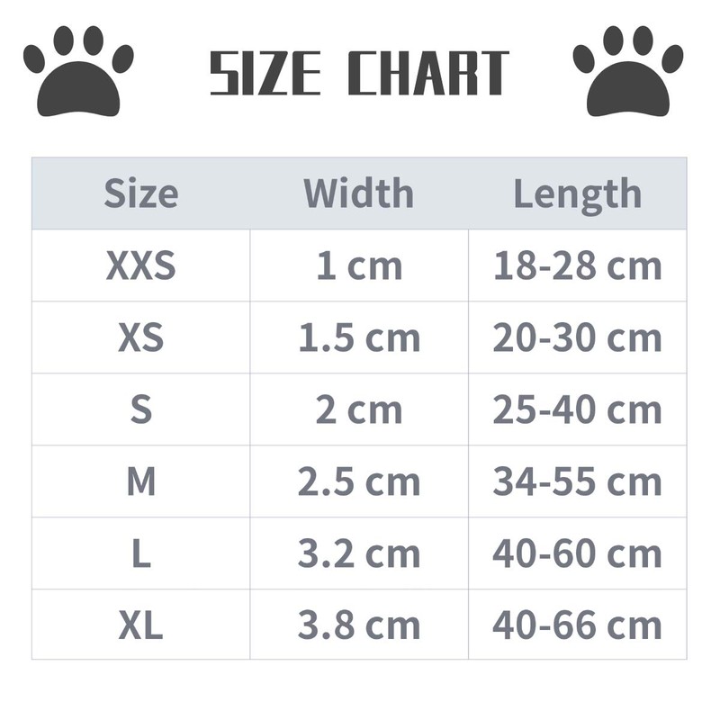XXS-Collar= (18cm~28cm) x 1cm XXS-Bowtie= 4.5cm x 7.5cm