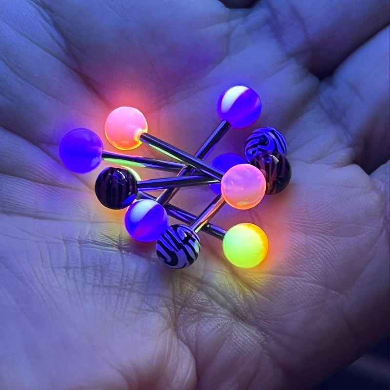 Barbells tongue rings 14 gauge solid titanium shaft acrylic beads glow up and animal print fit most tongue piercings standard size