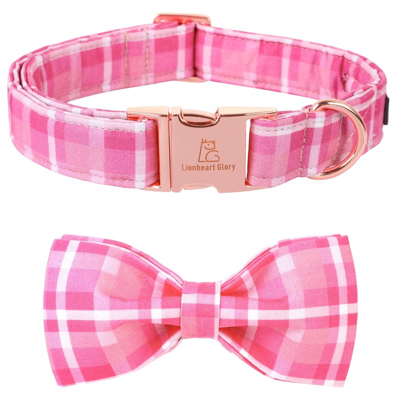 Lionheart Glory Pink Plaid Dog Collar, Adjustable Dog Collar with Bow Tie, Pet Gift Girl Collar for Dogs, Soft Bow Tie, Dog Collars for Small Dogs