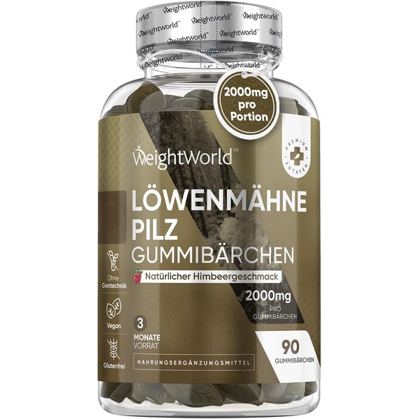 Lions Mane Mushroom Gummy Bears – 90 Gummies, 2000 mg per Serving, 200 mg Extract, Vegan & Raspberry Flavor
