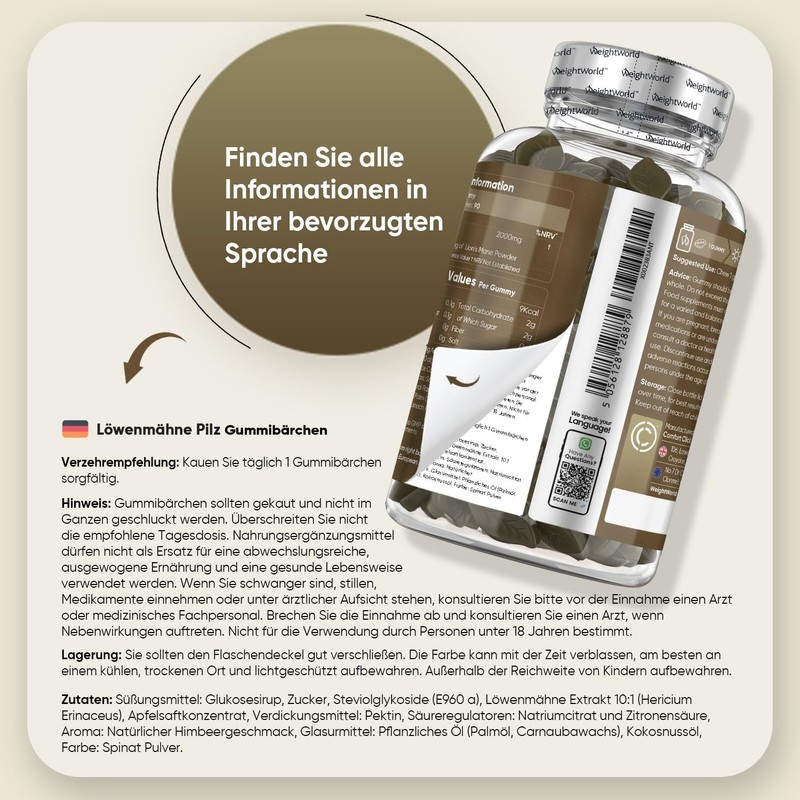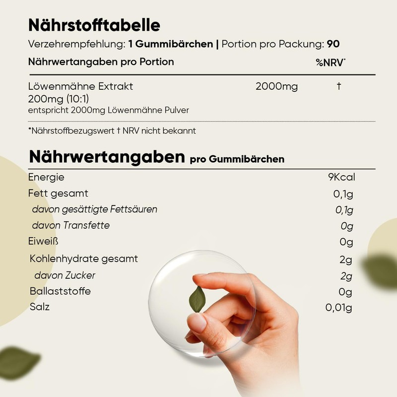 Ingredients: sweetener: glucose syrup, sugar, steviol glycosides (E960 a), lion mane extract 10:1 (hericium erinaceus), apple juice concentrate, thickener: pectin, acidity regulators: sodium citrate and citric acid, aroma: natural raspberry flavor, glaze agent: Paloil, carnauba wax), coconut oil, colour: spinach powder.