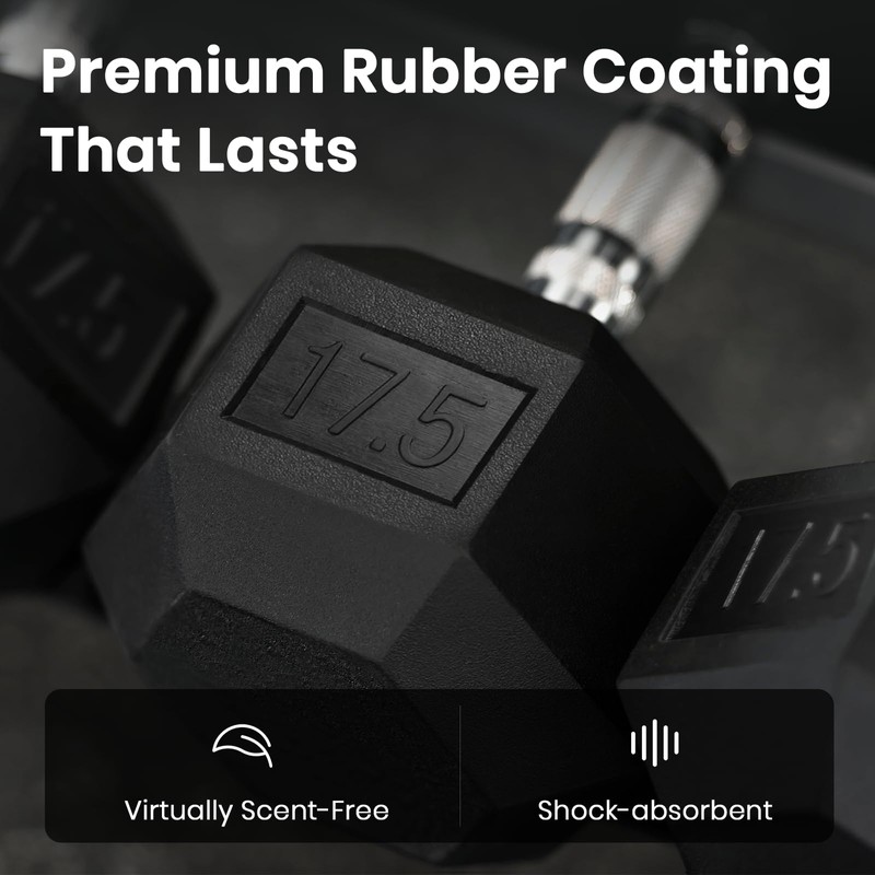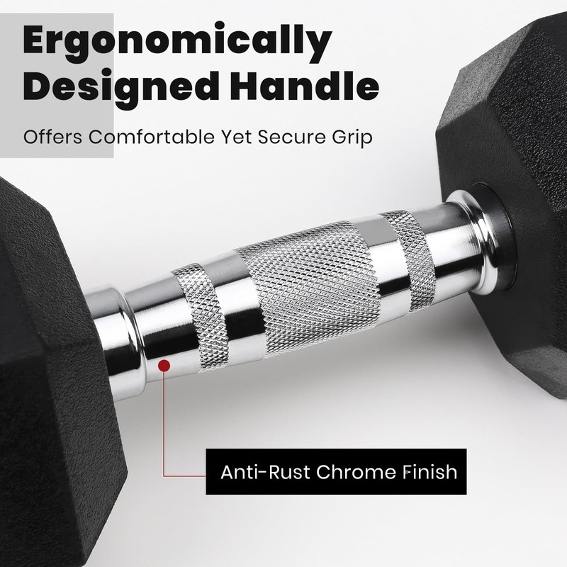 - Design Matters: The heavy-duty, rubber-encased hex heads prevent rolling, minimize noise and limit wear and tear (to both the dumbbells and your flooring), while the chrome-plated handle is ergonomically designed for a firm but comfortable feel in any grip style.