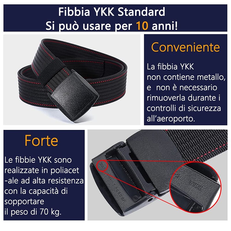 - International Standard YKK Buckle: high quality plastic belt buckle made of high strength polyacetal, can bear the weight of 150kg. This non-metallic buckle allows for easy release at security checkpoints